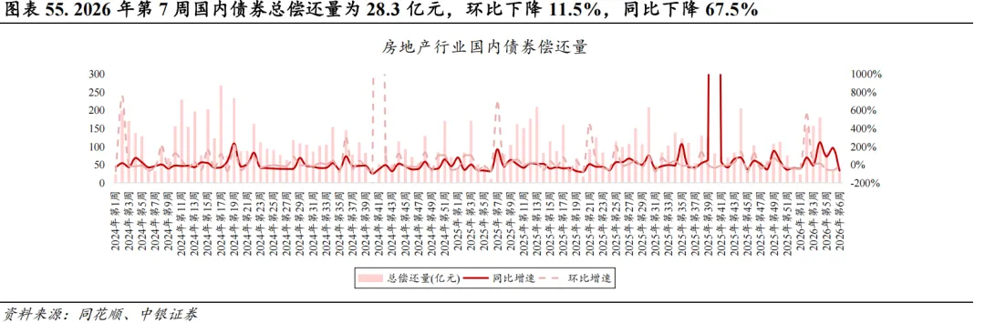 本周房企国内债券总发行量环比下降、同比上升,总偿还量同环比均下降。2026年第7周(2月7日-2月13日)房地产行业国内债券总发行量为82.1亿元,环比下降61.4%。总偿还量为28.3亿元,环比下降11.5%,同比下降67.5%(前值:185.1%);净融资额为53.8亿元。