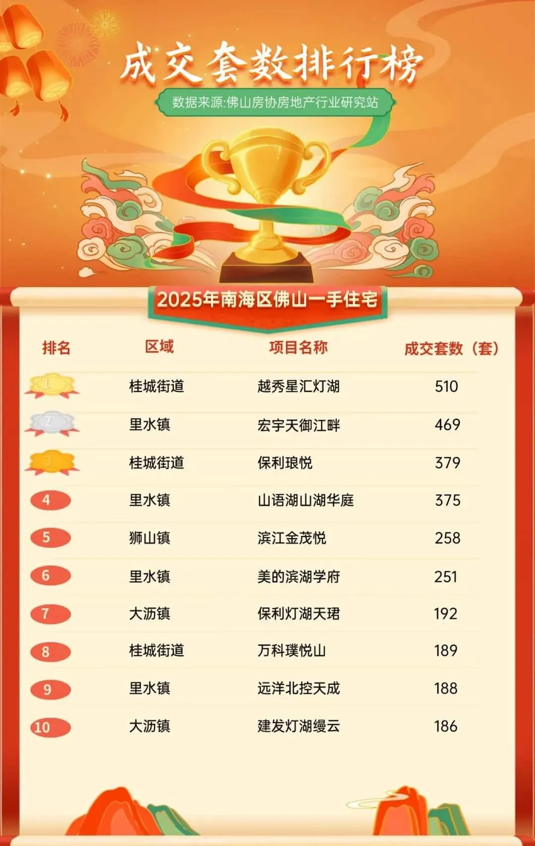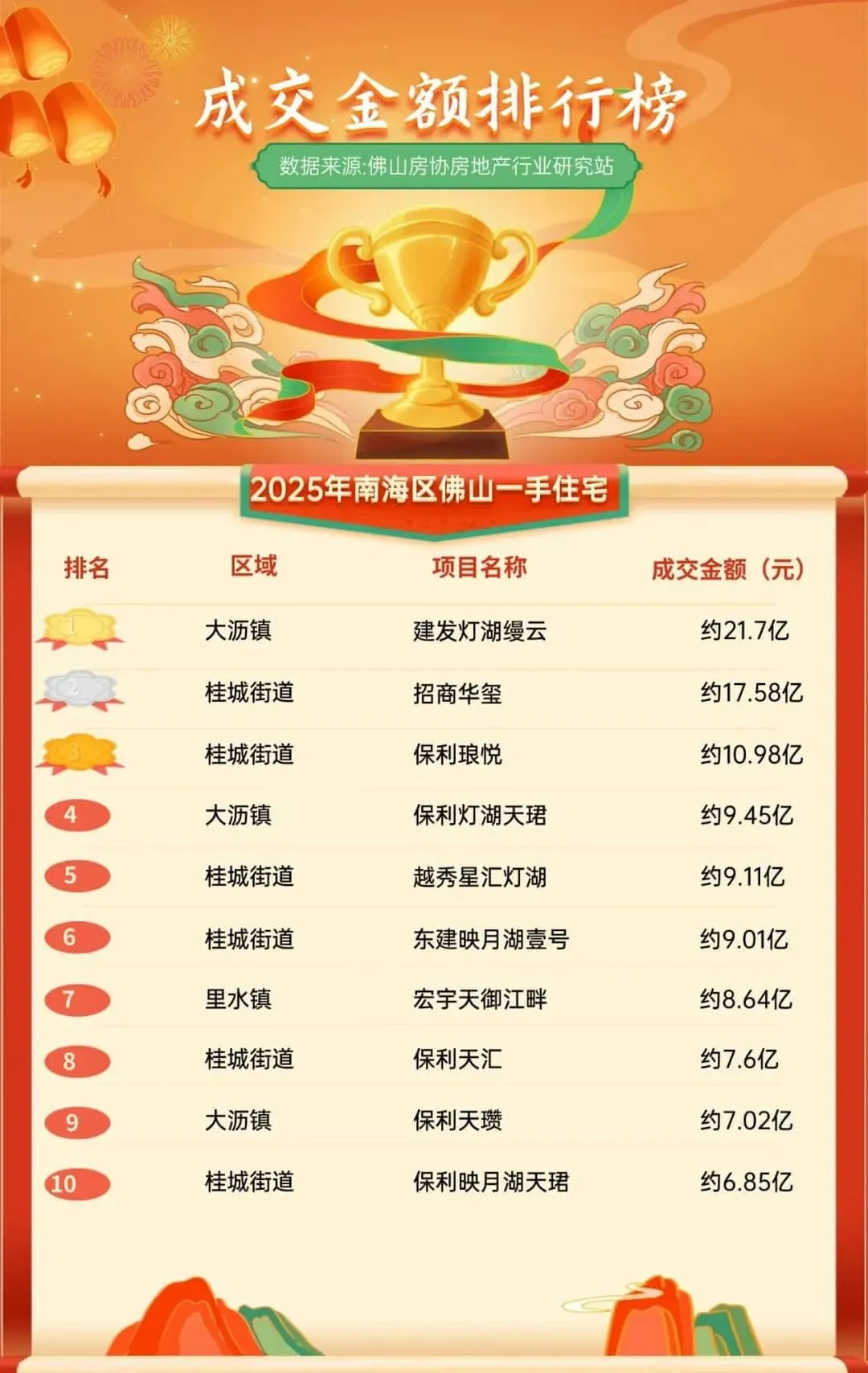 看看2025年的销售榜单就明白了。按成交金额排,南海区TOP10的楼盘,除了一个保利琅悦,其他清一色全是千灯湖中轴上的项目。