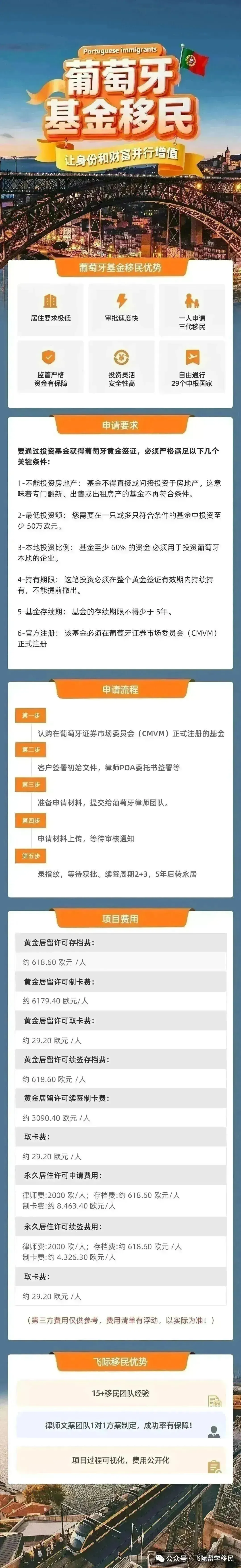 飞际移民在葡萄牙拥有专属本土团队,保持正式递交案件 0拒签;提供从签证申请、续签、永居到入籍的全流程管理,葡萄牙本土团队能直接对接移民局(AIMA),处理突发问题效率高。飞际移民认为,葡萄牙基金投资移民展现了在黄金签证投资方面的独特优势: