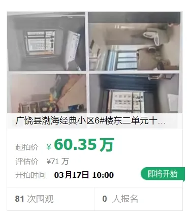 评估价:710000元,起拍价:603500元,保证金:60000元,增价幅度:5000元。