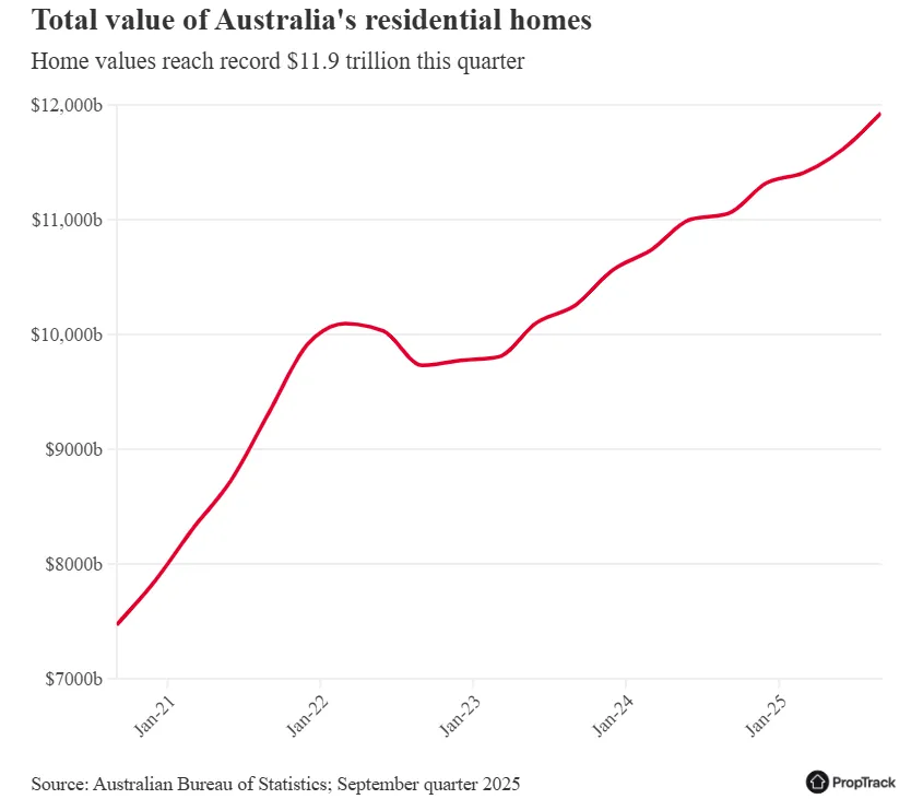 澳大利亚统计局12月的数据显示,澳大利亚1141万所住宅的价值在第三季度内增长了2.7%,较三个月前增加了3170亿澳元,达到接近12万亿。