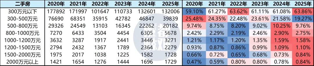 2025年,上海300万以下二手成交占比已经高达63.86%。