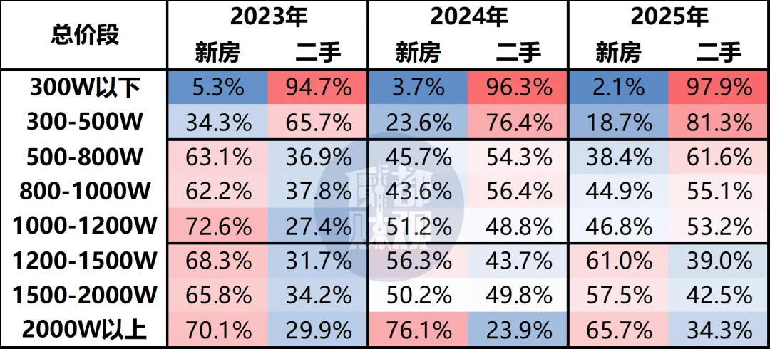2025年,上海300万以下及300-500万价格段,二手网签量占比超8成,是新房难以撼动的绝对领域。