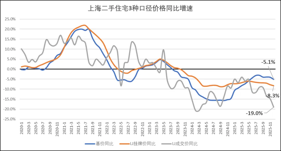 2025年上海楼市仍处于下行期,且成交价降幅在年底进一步扩大。