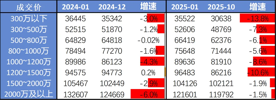 300万以下的刚需房以价换量最为明显,从25年1月到25年10月跌了13.8%。