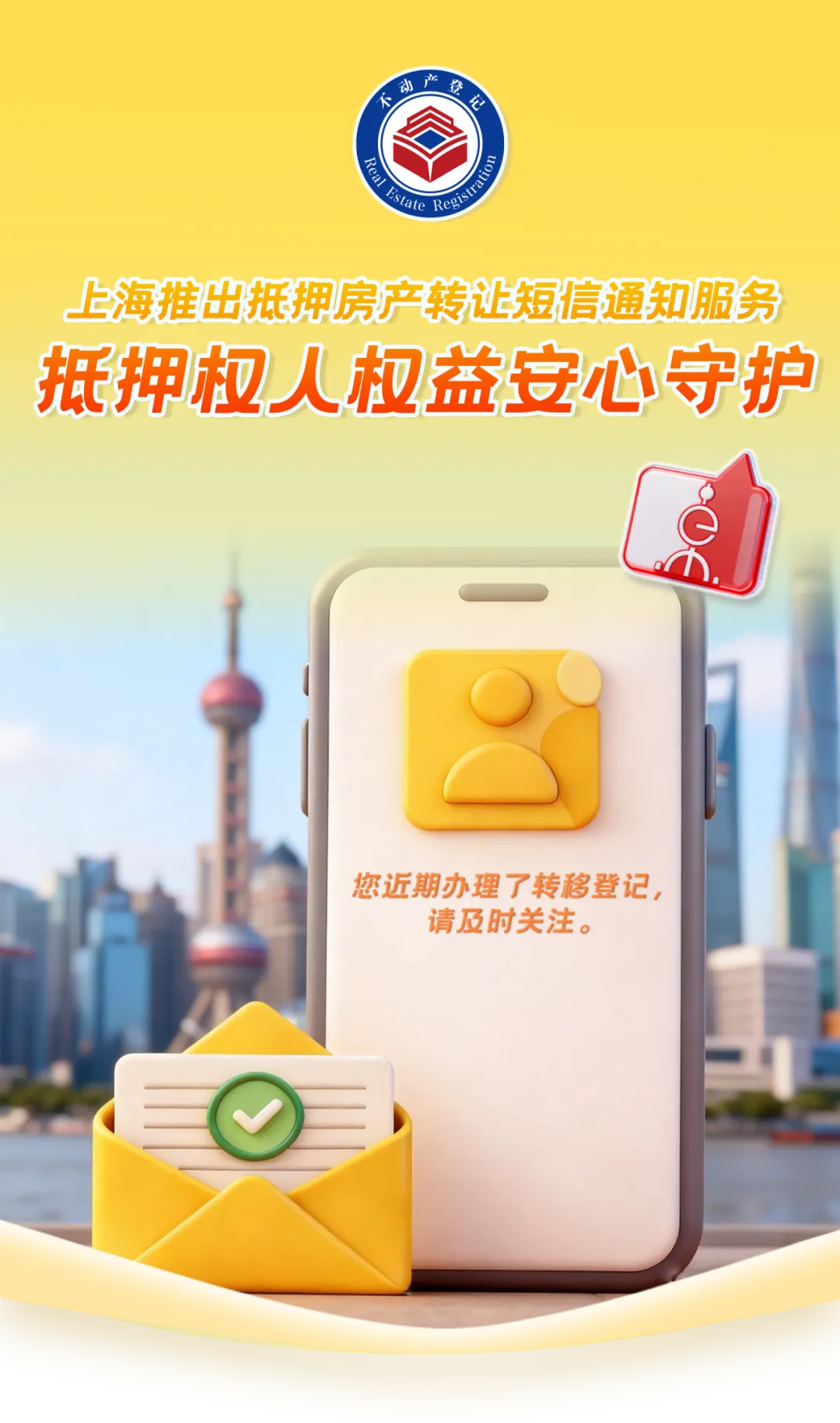 2026年1月7日起,在上海办理房产“带押过户”或一手房办产证时期房抵押转为现房抵押,系统会自动向抵押权人办理不动产抵押/预购商品房抵押登记时预留的手机号码发送短信通知。无需抵押权人主动问询,让信息透明化。抵押权人不需要费时去“盯系统”查询抵押物状态,在抵押物权属发生变动的第一时刻就能知情,避免信息不对称引发的矛盾。市规划资源部门用技术赋予了法律“温度”,新功能将法律条文转化为一项全自动的温馨服务,这不仅是对抵押权人知情权的有力保障,更是用技术手段优化营商环境、提升政务服务效率的生动体现。