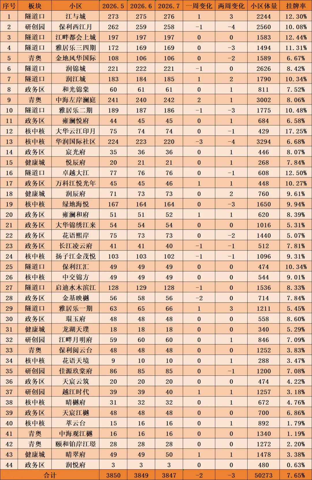 过去两周,江核二手房挂牌量下跌最多的小区是西江月(-4套)和华润国际社区(-4套),也是过去两周江核二手房的成交大户。
