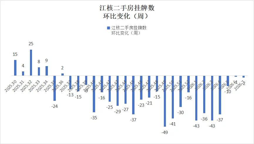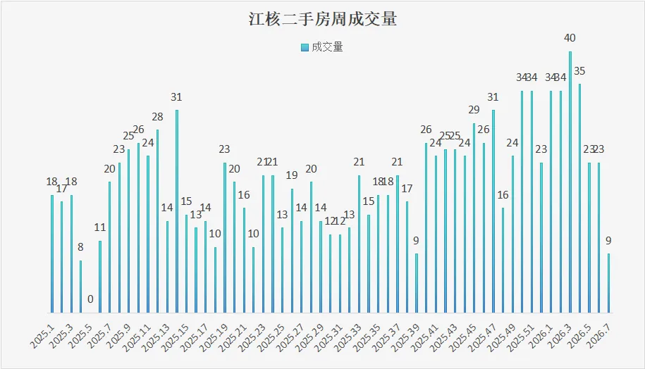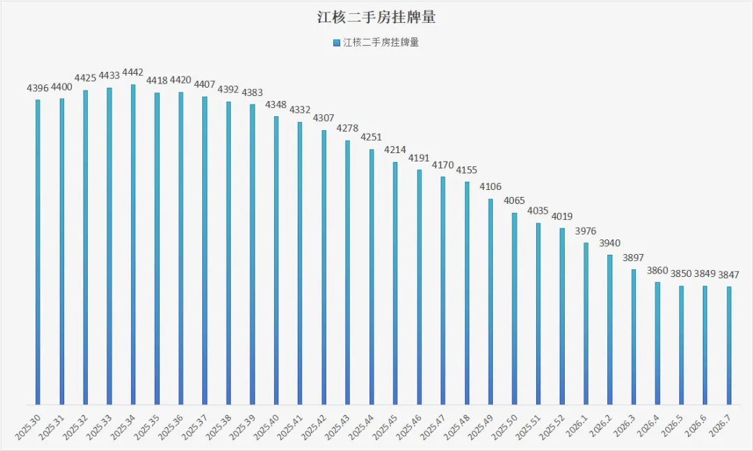 2026年第七周,江核二手房挂牌量继续下跌,不过跌幅很小,只有2套,挂牌量连续23周下降,基本上可以理解,就是进入过年状态了,大家都没心思工作了。上周的成交量为9套,为9月份以来的最低成交量,算是个正常数据吧,去年同期的数据为8套。