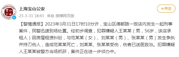 2023年3月31日17时10分许,宝山区德都路一饭店内发生一起刑事案件,民警迅速到场处置。经初步调查,犯罪嫌疑人王某某(男,56岁,该店承租人)因房屋租赁纠纷,与范某某(女)、刘某某(男)、张某某(男)发生争执并持刀伤人,造成范某某死亡,刘某某、张某某受伤,伤者已送医救治。