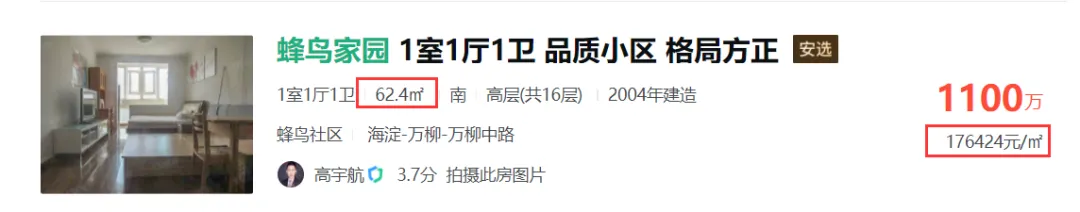 以安居客上一套62平米的房子为例,目前总报价1100万元,折合每平米17.6万元。