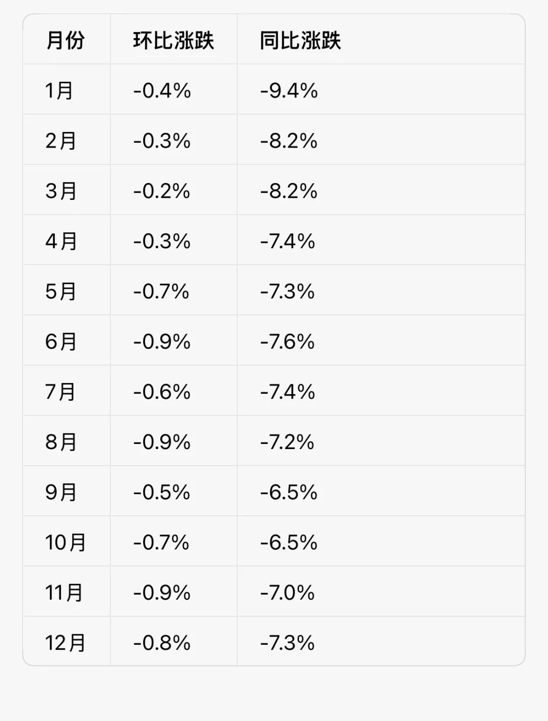和新房形成鲜明反差,2025年合肥二手房12个月环比全线下行,没有一次止涨转正。年初同比跌幅达9.4%,年末仍维持7.3%的跌幅,全年都未脱离下跌通道。