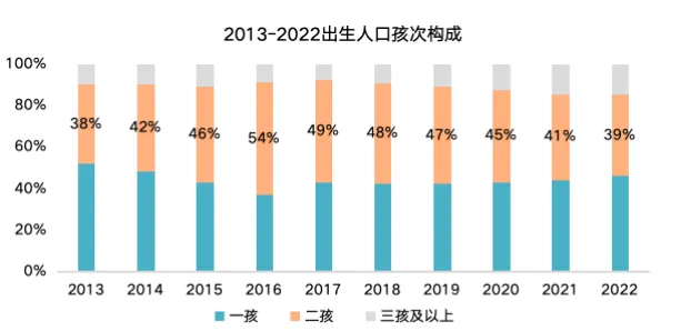 2016 年之后,二孩占比逐步回落。政策刺激的短期效应正在快速消退,从峰值的 54% 一路下滑到 2022 年的 39%。