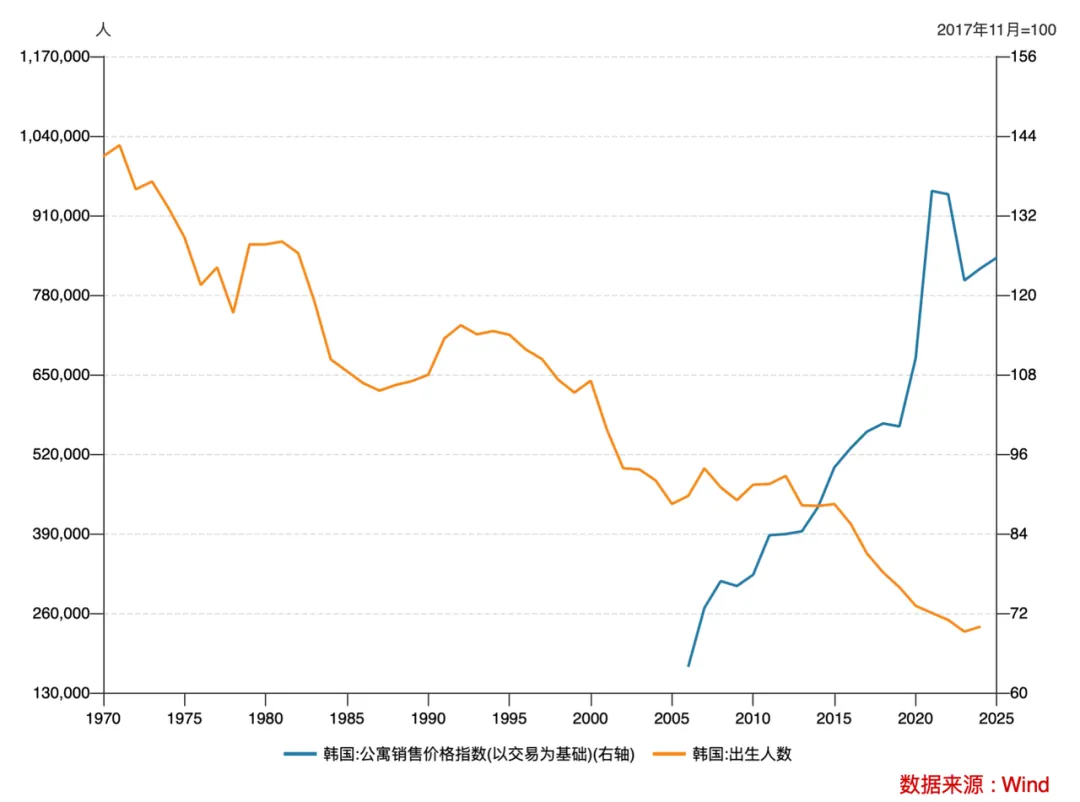 日本出生人口(左轴)与韩国公寓价格(右轴)走势图