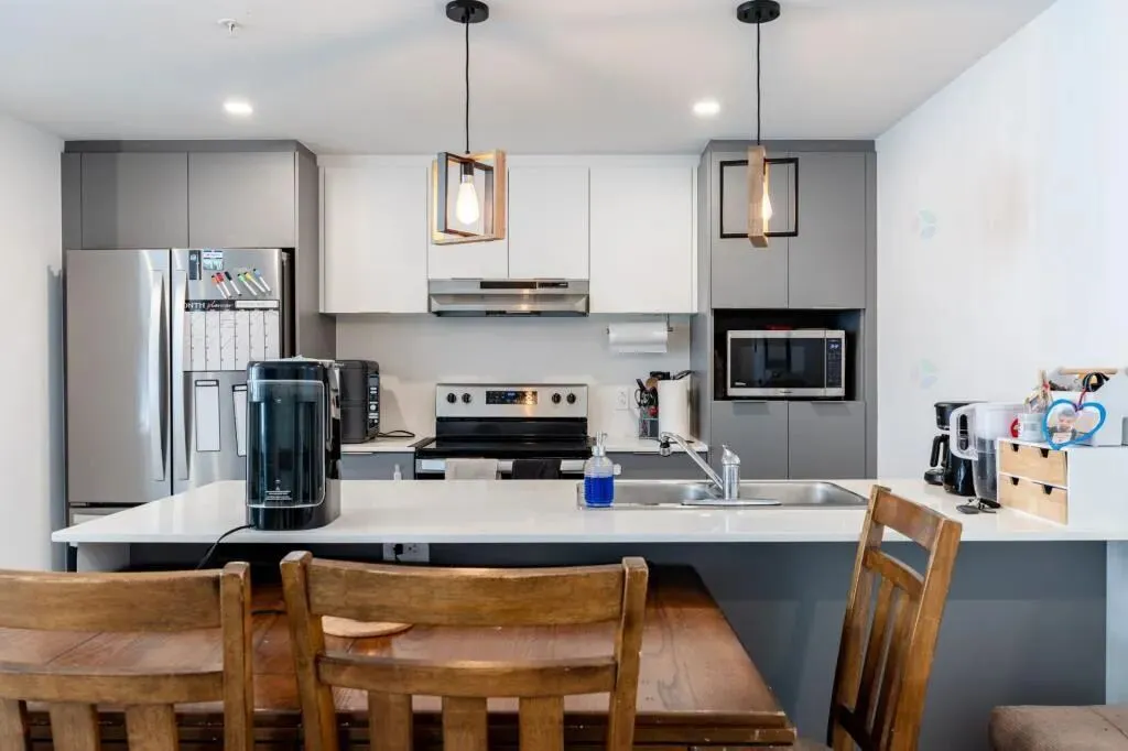 宽敞的现代厨房配备大型中岛与丰富的储物空间,开放式结构与餐厅、客厅自然衔接,营造出温馨宜人的氛围,非常适合与家人或朋友聚会。