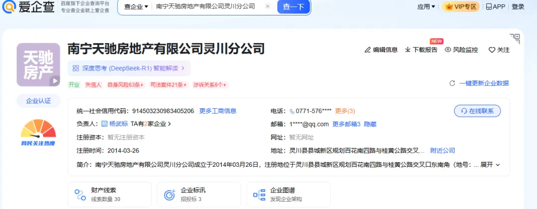 然而,天驰桂宏达·公园悦府的开发商南宁天驰房地产有限公司灵川分公司如今已成了失信被执行人。