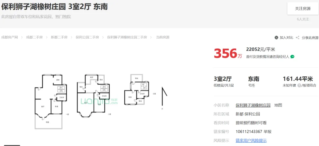 2026年02月19日,据市场端消息:成都新都198,保利狮子湖橡树庄园建面161平套三报价356万;目前房东心里价在356万愿意出售。