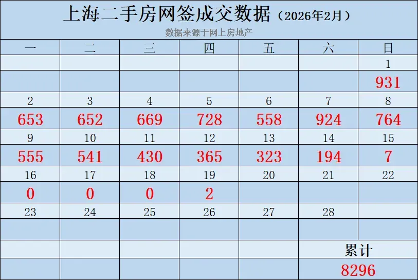 ▶ 上海2月二手房成交(统计截至2/19):2/19签约成交2套,2月二手房累计签约成交8296套(数据源自网上房地产);