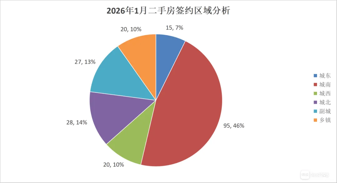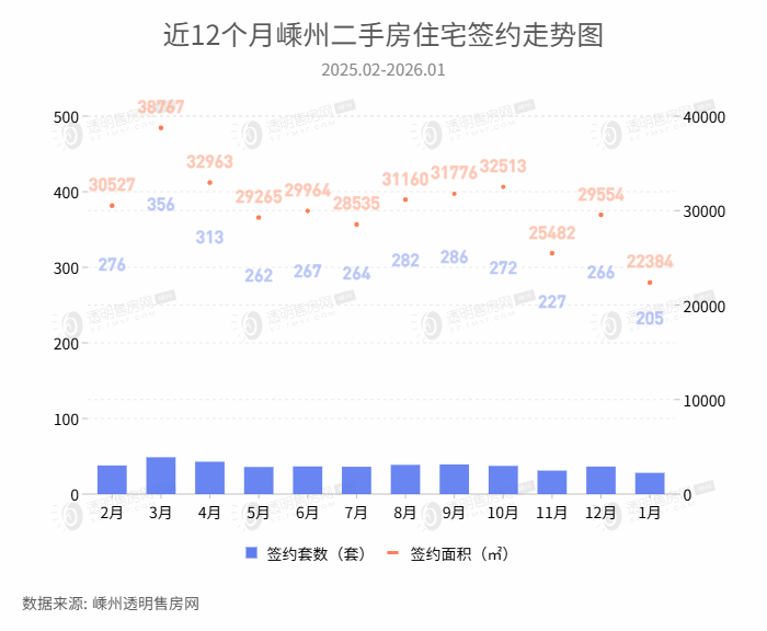 2026年1月二手房签约205套,签约面积22384㎡,签约量环比下降22.93%,同比下降17.00%。