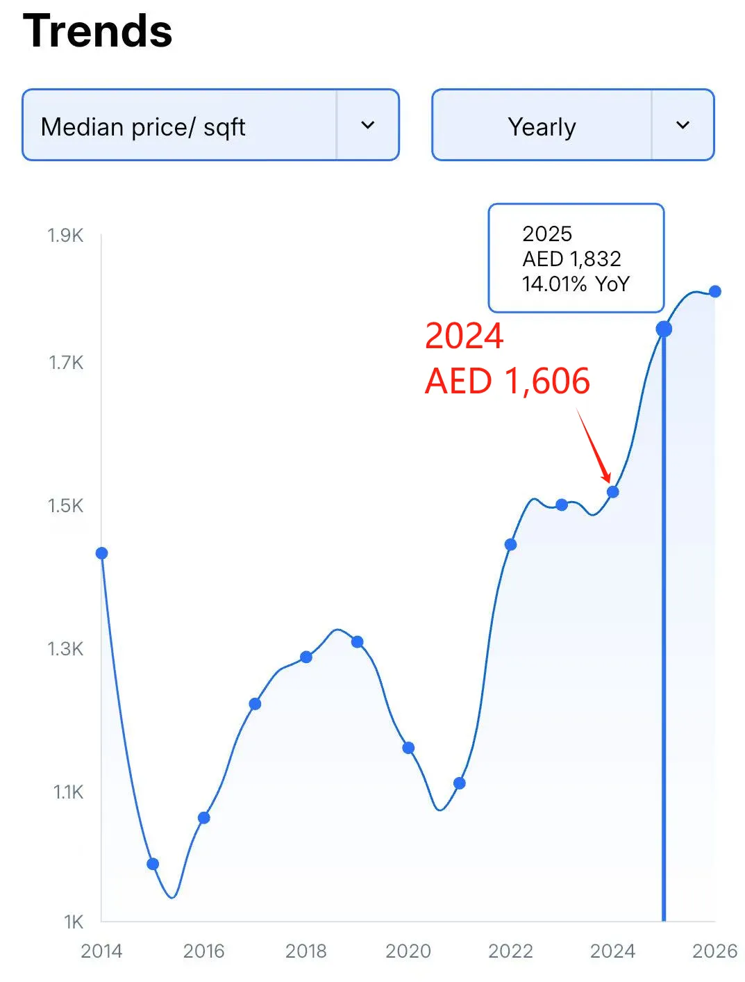 截止2025年第四季度,迪拜房价均价为1,911迪/平尺(2026年2月是1,873迪/平尺),已达到历史最高点。