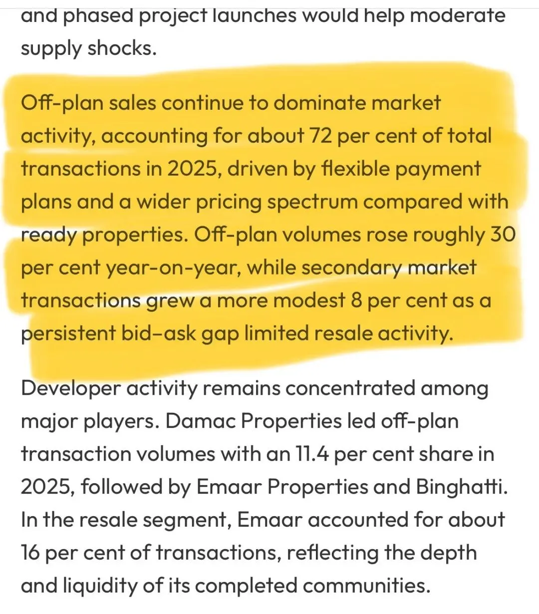 2025年,期房销售继续主导市场,占总交易量约72%。这种情况主要是由于期房提供了灵活的付款计划,以及相比现房更广的价格区间。期房成交量同比增长约30%,而二手市场交易仅温和增长了8%,这是因为持续存在的买家出价和卖家要价差限制了转售活动。