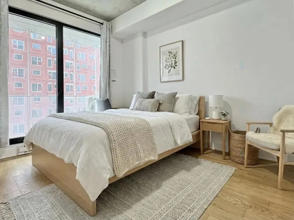 卧室正对雅克·卡蒂埃大桥,木地板、柔和灯光与步入式衣帽间共同营造静谧舒适的休憩氛围。单元还附有超大私人阳台,不仅延伸了生活空间,更将城市全景纳入视野,日夜皆景。
