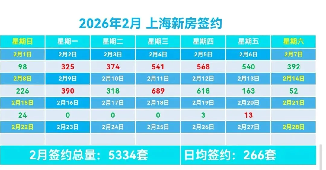 🏠2月上海新房总签约5334套,日均签约266套,本月签约总面积43.16万m²,套均面积87.15m²。
