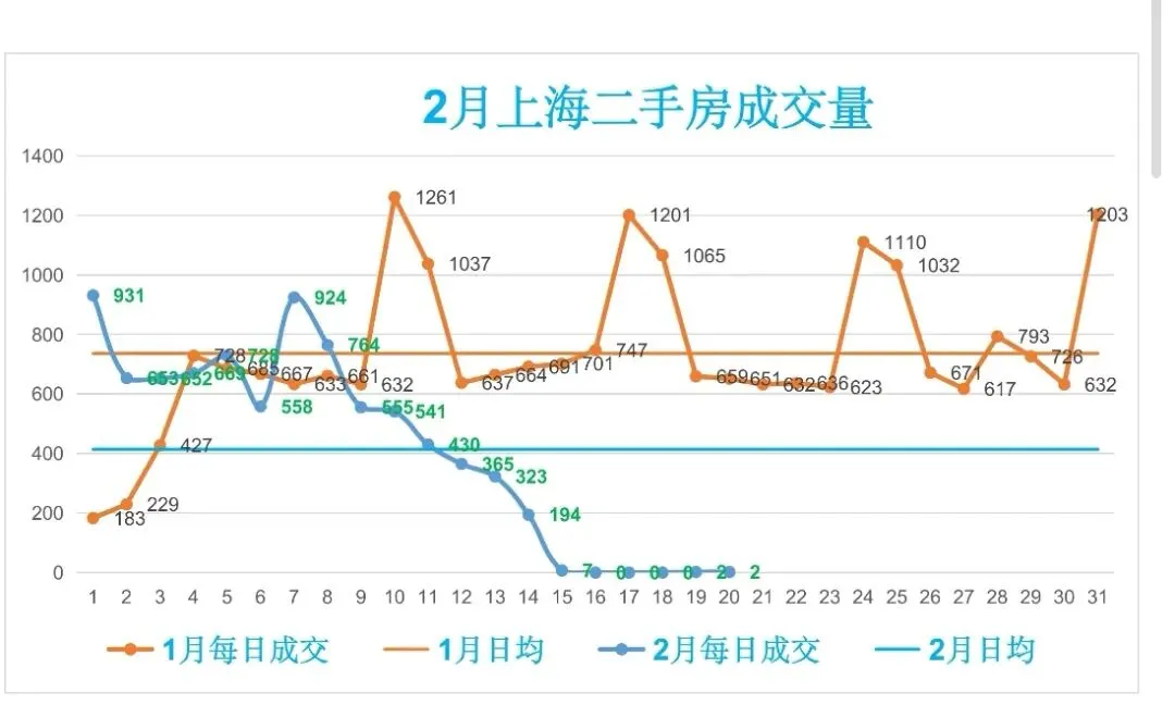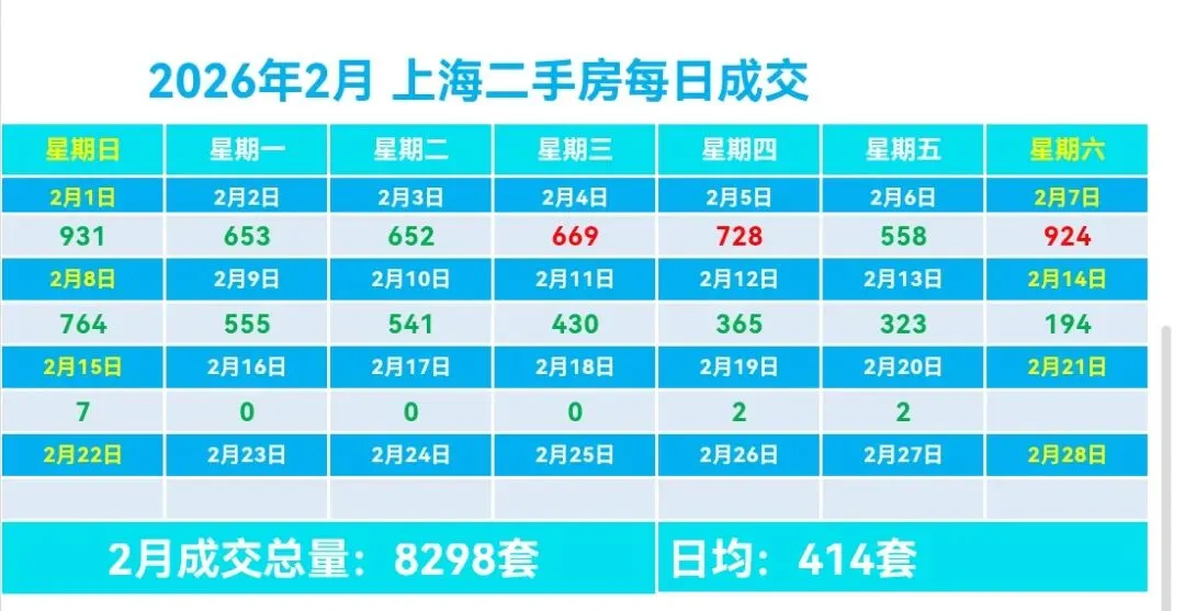 🏡2月,上海二手房成交量累计8298套,日均成交414套,较上个月日均减少322套(降幅43.75%)。