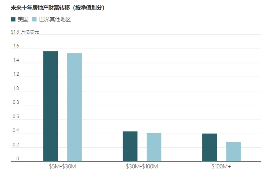 根据Coldwell Banker Global Luxury最新报告,全球将有约120万名身家500万美元以上的高净值人士,在未来十年向下一代传承超过38万亿美元的财富。而其中,约4.6万亿美元将以房地产的形式完成交接,仅美国就占了将近2.4万亿美元。这不是一条财经新闻,这是一场正在重塑全球高端房地产市场、家族资产结构和财富管理方式的“历史级迁移”。未来十年房地产财富转移(按净值划分)