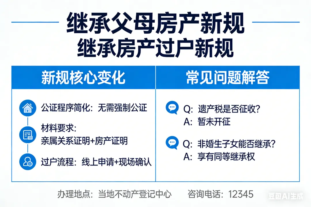 不管你是已经面临房产继承,还是未来可能继承父母房产,这篇文章一定要看完、收藏、转发给家人!2026年继承父母房产及过户新规又有新调整,取消了多项旧规限制,简化了流程、降低了成本,但也新增了不少注意事项。很多人因为不懂新规,要么白白多花几万块,要么陷入继承纠纷,甚至错过过户最佳时机,追悔莫及。不同于以往“繁琐复杂、耗时耗力”的继承流程,2026年新规更偏向“便民、公平、高效”,尤其针对“独生子女继承”“多子女分割”“过户税费”等大众最关心的问题,做出了明确优化。今天,就用最通俗的语言,把2026年继承父母房产、过户的全部新规,一次性讲清楚、说明白,避开所有坑,让你轻松办理,少花冤枉钱!重点提醒:本文所述新规,适用于2026年全国范围内父母房产继承及过户,不分城市、不分房产类型(商品房、房改房、安置房均适用),建议全文精读,重点内容做好标记。一、2026继承父母房产核心新规(必看!取消旧规,新增福利)