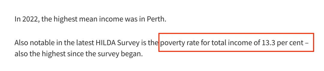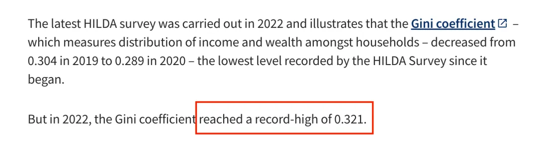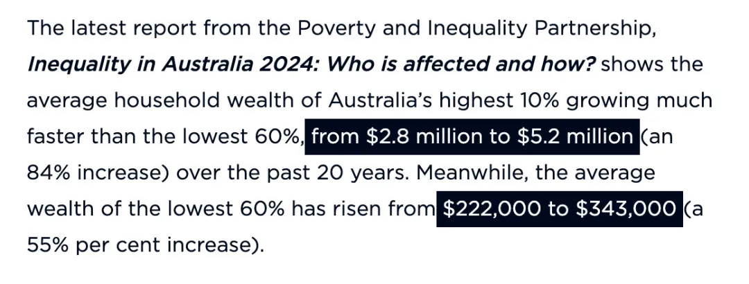墨尔本大学2025年3月发的HILDA调查报告显示,澳洲的收入基尼系数(Gini Coefficient)升到了0.321,创下22年来的新高。这是这个调查做了22年以来的最高值。贫困率也到了13.3%,创纪录。ACOSS(澳洲社会服务委员会)和UNSW(新南威尔士大学)2024年的联合报告讲得就更直白了——过去20年,最富的10%家庭拿走了全社会45%的财富增长。平均家庭财富从280万涨到520万。而最底层60%的家庭呢?从22万涨到34万。你算算这个差距。一边涨了快九成,一边才涨了五成多,要是算上通胀,涨得就更少了。