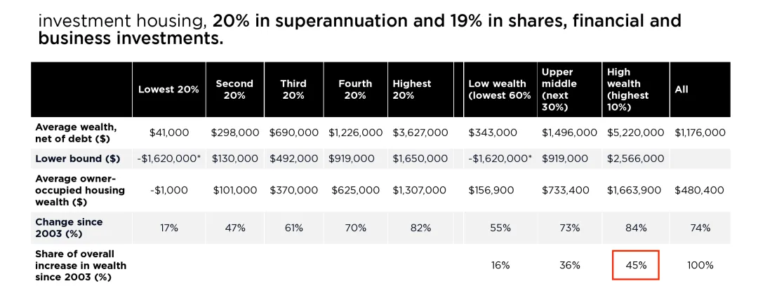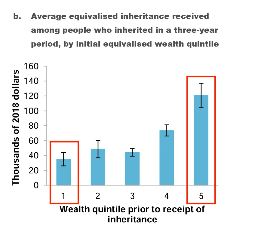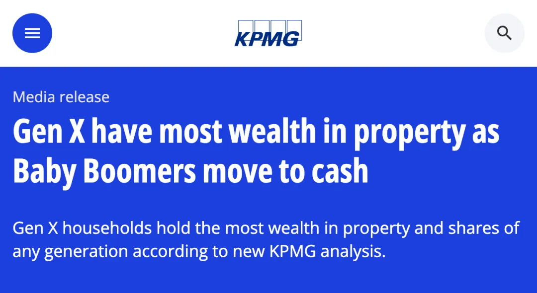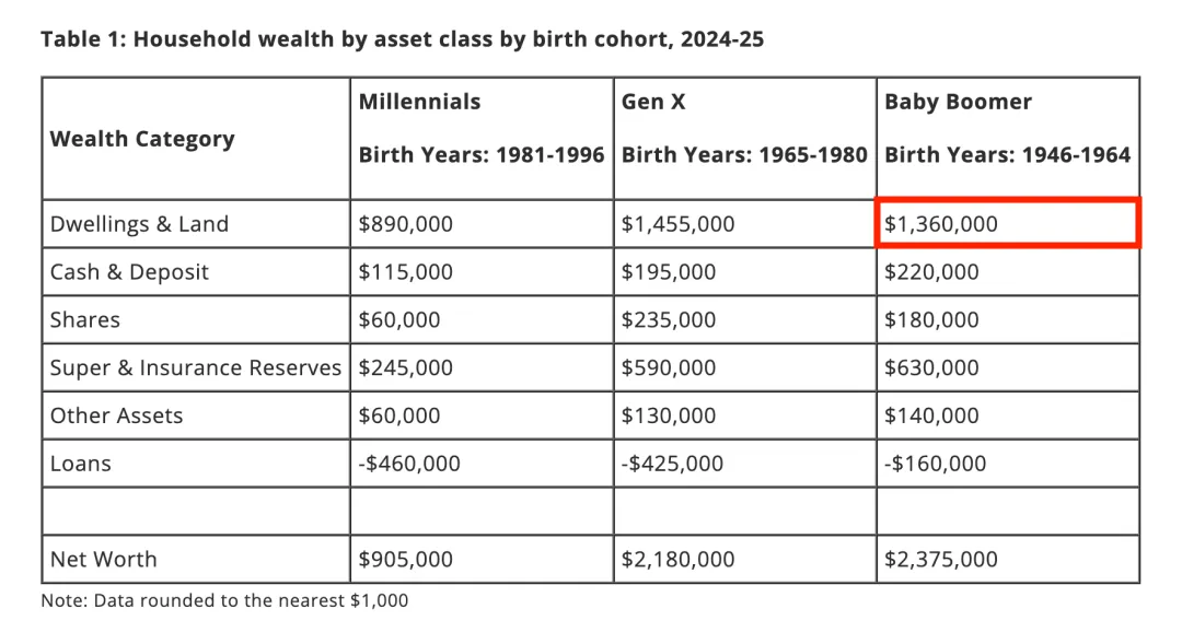 KPMG(毕马威)今年1月的报告显示,婴儿潮一代(Baby Boomers)平均每户净资产246万澳元。其中房产占了136万,是大头。未来二三十年,预计有3.5万亿到5.4万亿的资产会通过遗产传给下一代。听着挺好?有钱传下来了。问题是——钱来得太晚了。澳洲继承遗产最常见的年龄是50多岁到60出头。但你30岁就需要首付买房了。最穷的20%家庭平均继承3500块。最富的20%呢?平均继承12万1千澳币。