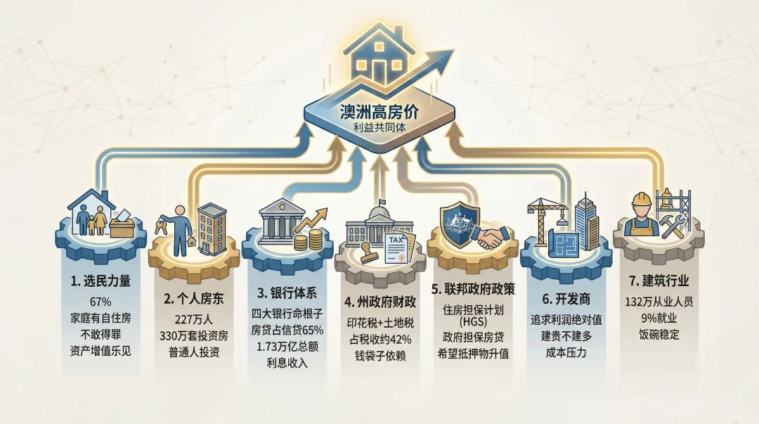 澳洲政府花了205亿帮年轻人买房。结果呢?房价涨了18.8%。你没听错。纳税人掏了205亿,买不起房的人——更买不起了。你以为这是政策失误吗?不是。我花了1周时间把所有跟房价有关的利益方数了一遍——选民、银行、州政府、联邦政府、房东、开发商、建筑业。7大力量。想让房价降的,一个都没有。