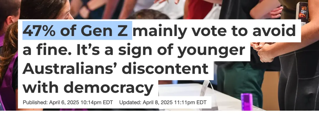 更有意思的是——固定投同一个党的选民,从1967年的72%降到了现在的37%。Griffith大学(格里菲斯大学)有个调查说,47%的Z世代投票主要是因为不想被罚20块钱。你想想,将近一半的年轻人不是在"支持谁",而是在"不想被罚"。这说明什么?说明传统的政治格局在松动。