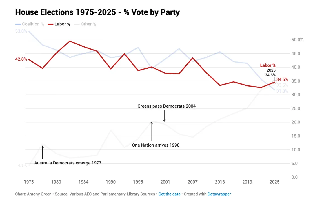 20年前每7个澳洲选民里只有1个投小党。现在呢?每3个人就有1个。2025年联邦大选创了个历史纪录——小党加上独立候选人的得票合计超过33%,第一次超过联盟党(Coalition)。两大党的合计得票也是第一次跌破三分之二。