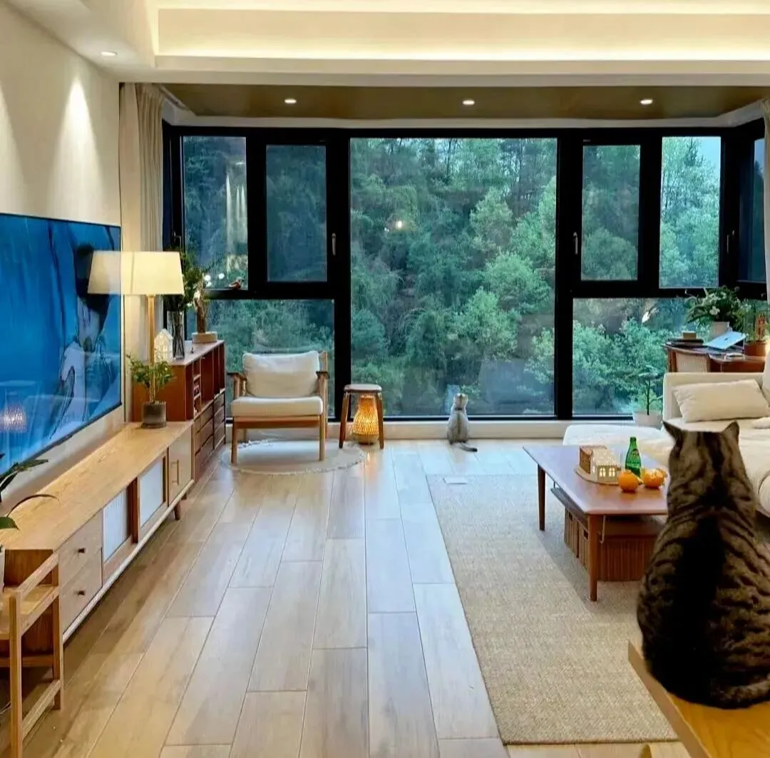 这一张我特别喜欢,大窗把树林借进来,客厅立刻不需要太多装饰。