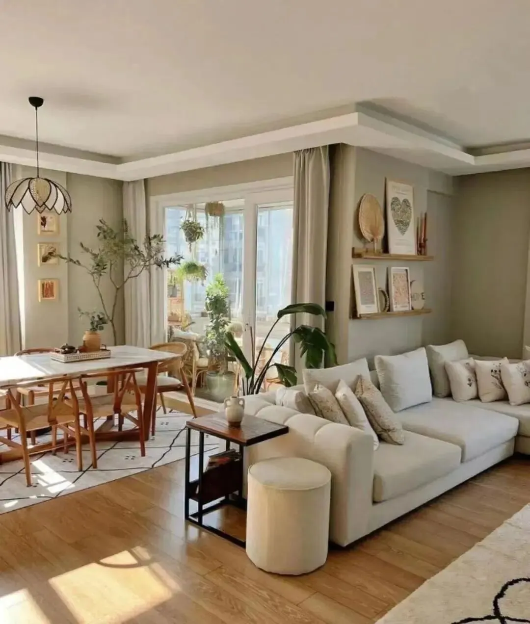 配色也很会,灰墙加奶白沙发,木地板压住温度,怎么看都不累。