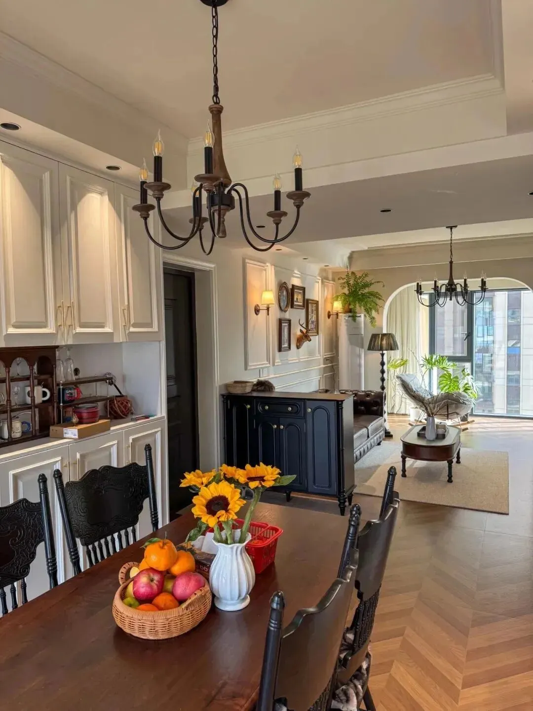 吊灯、护墙板、深色餐椅,都是氛围组。