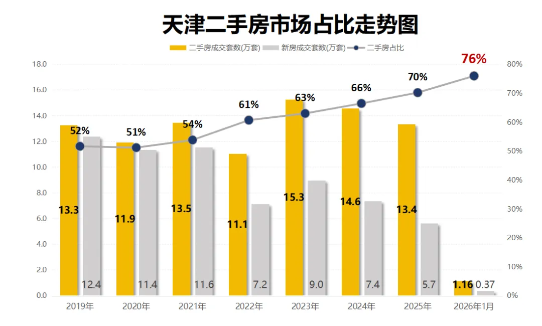 按套数,天津1月二手房成交占比,已经达到了惊人的76%!