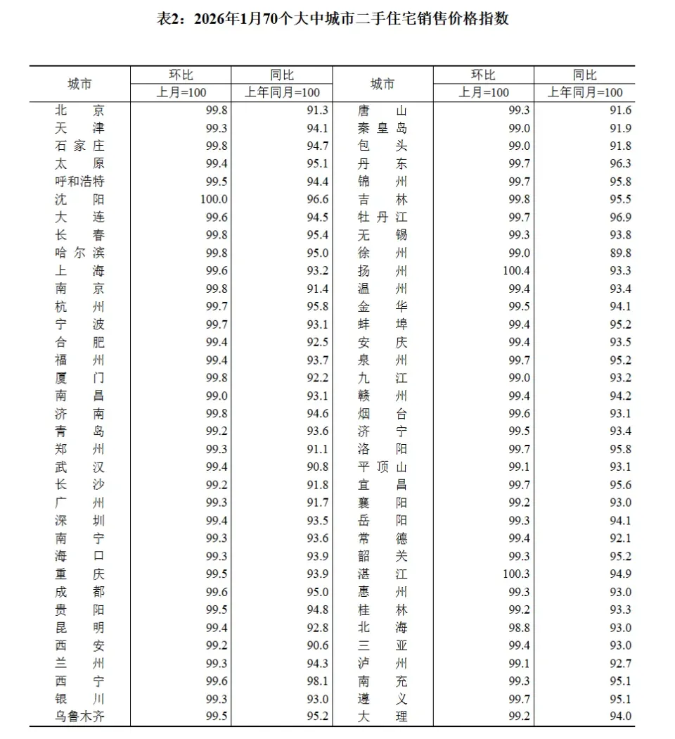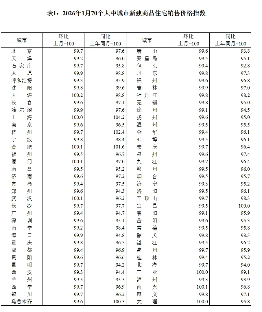 国家统计局相关数据显示,2026年1月份70个大中城市商品住宅销售价格环比降幅总体收窄、同比下降。