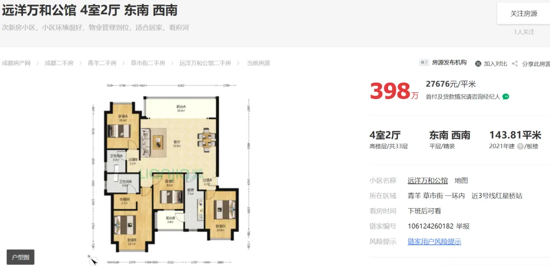 2026年02月21日,据市场端消息:成都青羊草市街,远洋万和公馆建面144平套四报价398万;目前房东心里价在398万愿意出售。