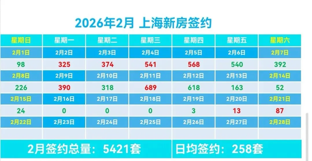 🏠2月上海新房总签约5421套,日均签约258套,本月签约总面积43.9万m²,套均面积87.04m²。