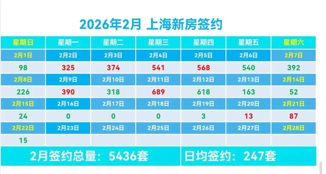 🏠2月上海新房总签约5436套,日均签约247套,本月签约总面积44.09万m²,套均面积89.12m²。
