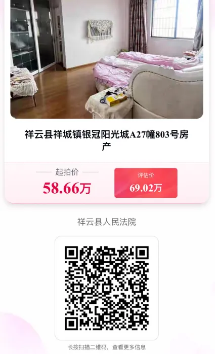 一、拍卖标的:位于祥云县祥城镇银冠阳光城A27幢803号房产,用途为城镇住宅用地,类型为单元式住宅,总楼层9层,所在楼层为第8层。房屋结构为框架结构,房屋朝向为南北向,房屋建筑面积128.03㎡,分摊土地使用权面积为14.54㎡。房屋实际状况为:客厅、餐厅地面铺木地板、墙面为墙纸、墙砖;卧室地面铺木地板,卫生间地面铺设地板砖、墙面贴墙砖、集成吊顶;入户门为复合防盗门、铝合金窗。设备设施:水电暗装,功能布局:三室二厅一厨二卫一阳台。周边道路通达度较好,停车较方便,公共服务设施配套较完善,区域内空气清新,自然环境较好,治安状况较好,人文环境较好,交通便利,市政和公共设施齐全。