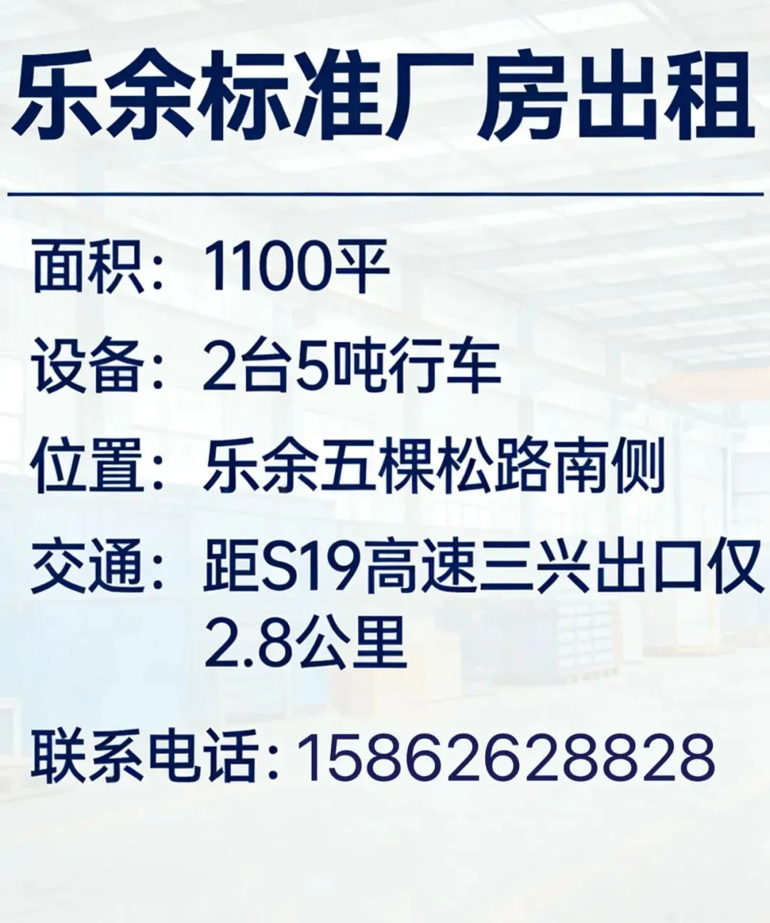 【厂房地址】乐余五棵松路南侧,距S19高速三兴出口仅2.8公里