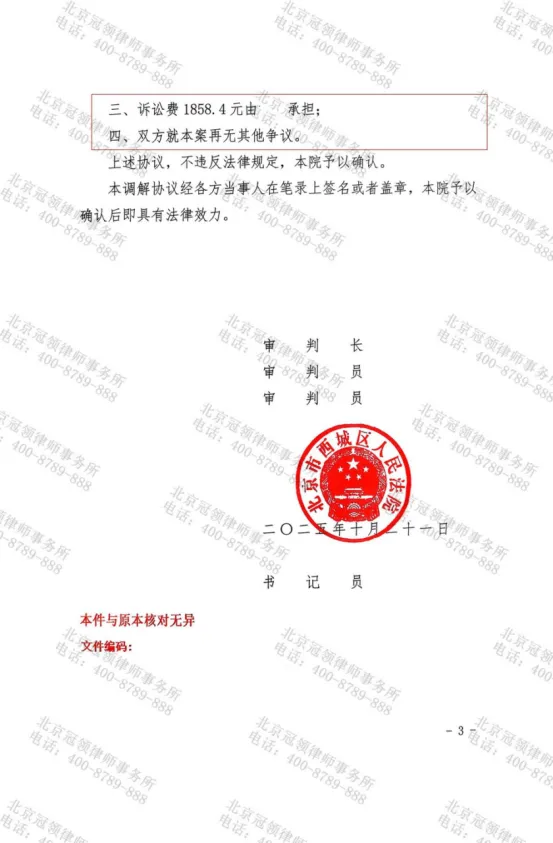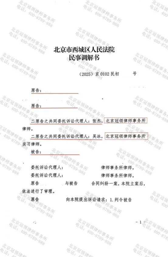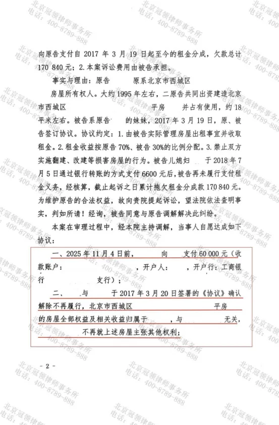 2025年10月,北京市西城区人民法院调解室内,一场家庭房产收益纠纷在冠领律师的代理下,争议双方握手言和。张明德、孙丽雅夫妇因妹妹张晓月拖欠多年租金分成将其诉至法庭,冠领律师基于二人身患重病,无力照看房屋,代理二人与被告方达成调解协议,被告支付6万元欠款,涉案房屋全部权益及相关收益归属张晓月所有,实现了债务清偿与产权归属的一揽子解决。