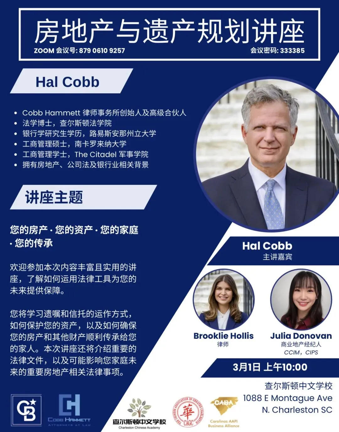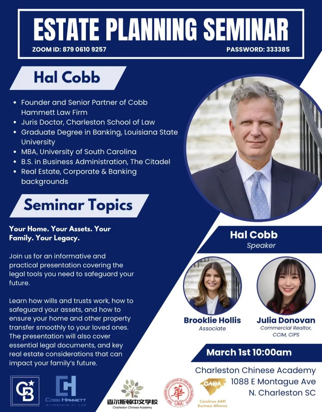 Hal Cobb 律师拥有深厚的学术背景(查尔斯顿法学院法学博士、路易斯安那州立大学银行学研究生、南卡罗来纳大学 MBA)及多维度的实战经验。他在房地产法、公司法及银行业领域造诣深厚,是本地极具影响力的法律专家。