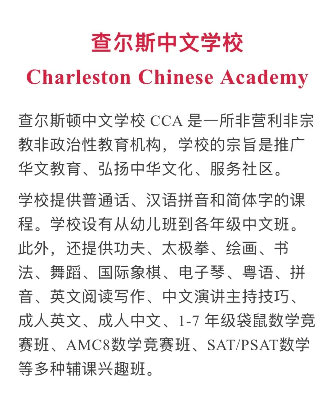 1. 查尔斯顿中文学校 (Charleston Chinese Academy) —— 植根社区,不仅传播文化,更心系华人家庭成长。
