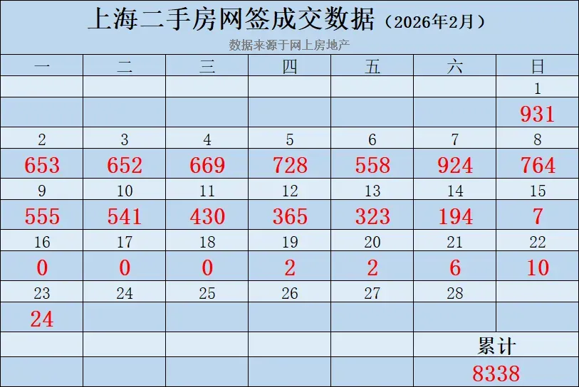 2026年2月上海二手房成交统计:(数据来源网上房地产)