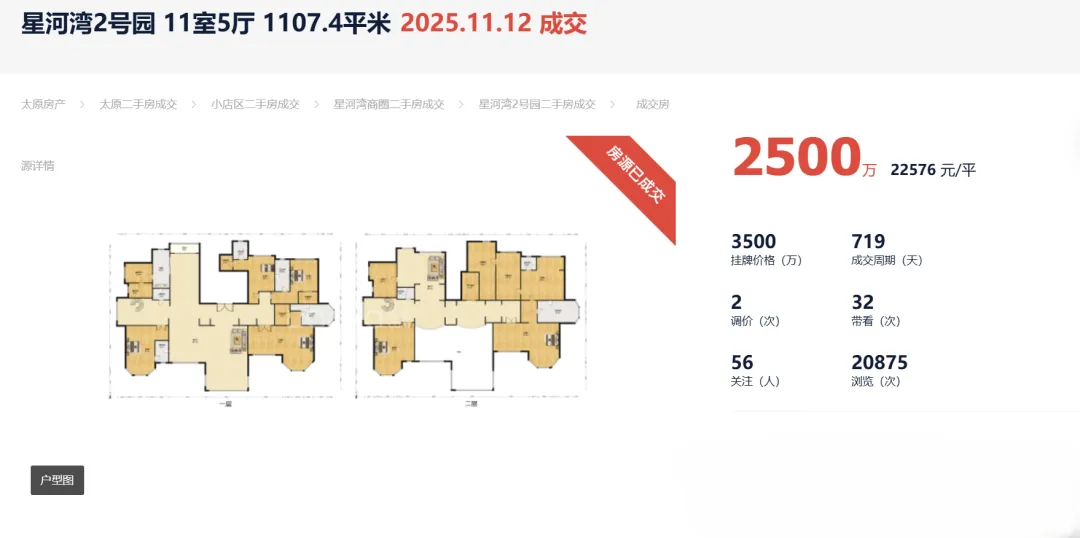 2025年成交总价最高为小店区的星河湾2号园,该房源户型建面约1107.4平的11室5厅,成交单价22576元/平,成交总价2500万。