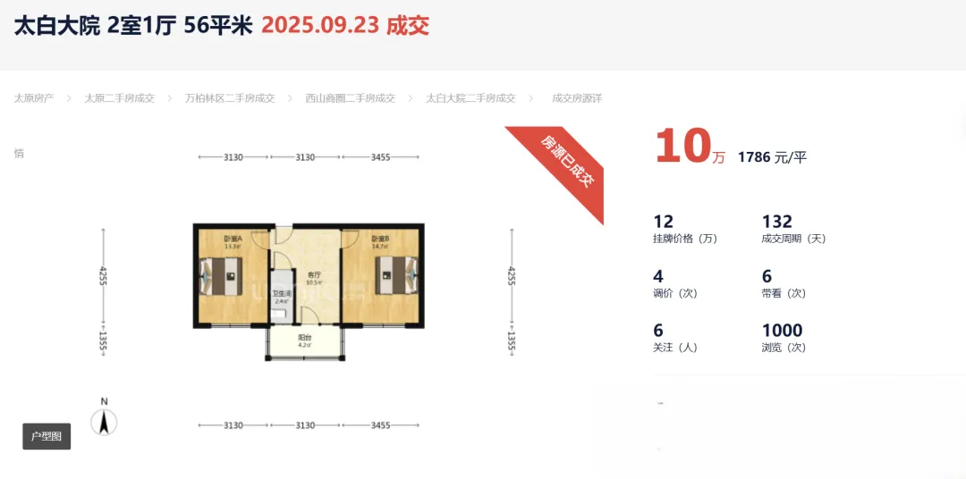 2025年成交总价最低为万柏林区的太白大院,该房源户型建面约56平的两室一厅,成交单价仅1786元/平,成交总价定格在10万,比挂牌价足足便宜了2万元。